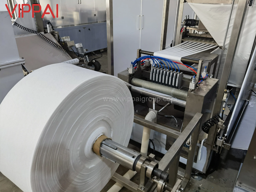 The Vippai VPD-800A Alcohol Pad Making Machine is designed to offer unparalleled versatility and high-throughput production. This remarkable pad making machine can automatically cut one large roll into 8 smaller rolls or utilize 8 separate non-woven rollers, enabling simultaneous production on 8 lines. This feature not only increases the machine’s overall output but also enhances its flexibility, allowing businesses to adapt to changing market demands and production requirements.